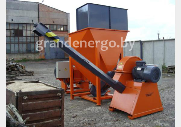 Для равномерной подачи щепы после первичного дробления молотковая дробилка оснащена бункером — дозатором, откуда материал подается через отверстие в мельницу. Измельчение осуществляется за счет высокой частоты вращения ротора. Измельченный продукт просеивается